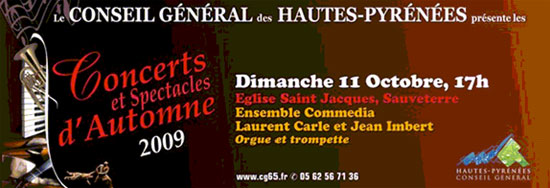 Après un concert d’ouverture très remarqué et même remarquable à l’Abbaye de l’Escaladieu avec l’Ensemble Baroque de Toulouse où le public a découvert les secrets de l’écriture musicale de JSBach et a été invité à chanter avec les artistes, le Conseil Général des Hautes Pyrénées donne un deuxième rendez-vous : Dimanche 11 octobre à 17h, à l’Eglise Saint Jacques de Sauveterre (canton de Maubourguet), pour un concert Orgue et Trompette avec Laurent Carle et Jean Imbert.
