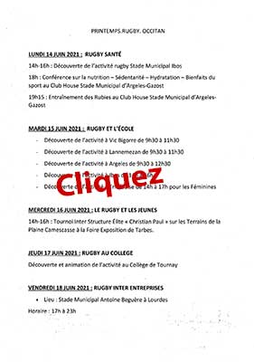 • Première réunion de bassin des clubs, à Aureilhan (stade), à 20 h 30, le jeudi 9 septembre 2021. Sont invités : les clubs de Castelnau-Madiran, Vic-en-Bigorre, Rabastens, Maubourguet, Bazet, OBRC, Pouyastruc, Trie et Aureilhan.
